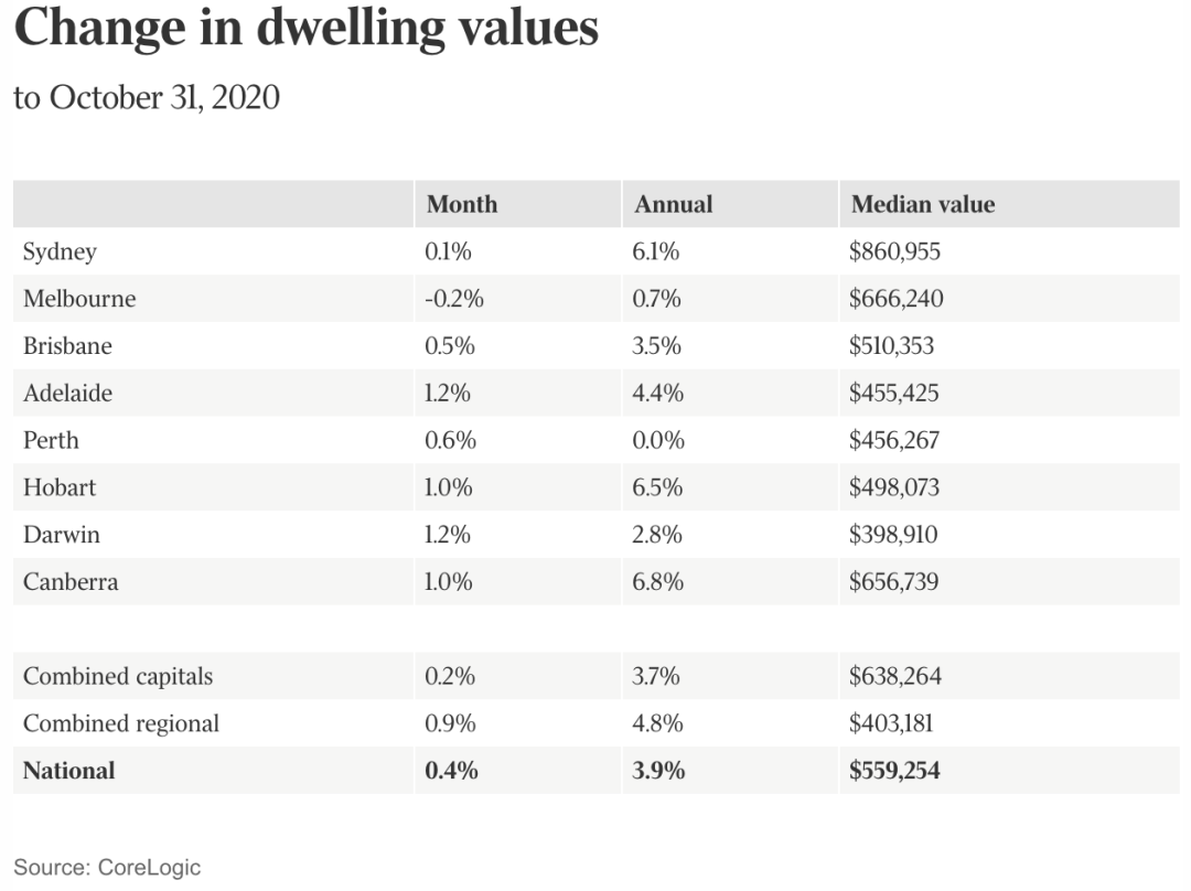 不過根據(jù)地產研究機構CoreLogic最新的數(shù)據(jù)顯示:自疫情爆發(fā)以來,澳洲房價首次出現(xiàn)了整體上漲,10月份澳洲全國住宅房產價格整體上漲了0.4%,中位價達到559254澳元。除了遭受第二波疫情的墨爾本房價仍有小幅下降之外,其他首付城市房價均在上漲。業(yè)內專業(yè)人士稱,各種數(shù)據(jù)表明澳洲房市或以觸底。