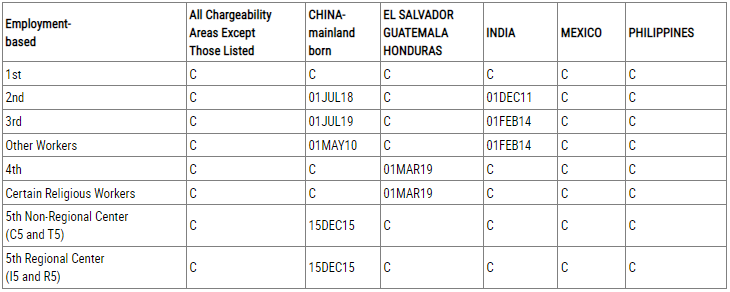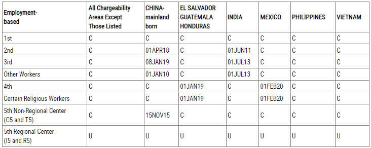根據(jù)職業(yè)移民簽證排期表A,對(duì)于中國(guó)大陸出生的申請(qǐng)人,EB-1、EB-4類(lèi)別繼續(xù)維持無(wú)排期狀態(tài);EB-2類(lèi)別排期為2018年4月1日,前進(jìn)4個(gè)月;EB-3類(lèi)別排期為2019年1月8日,前進(jìn)7天;EB-5直投類(lèi)別排期為2015年11月15日,前進(jìn)7天;EB-5區(qū)域中心類(lèi)別顯示“U”,因法案暫停暫無(wú)簽證名額可用。
