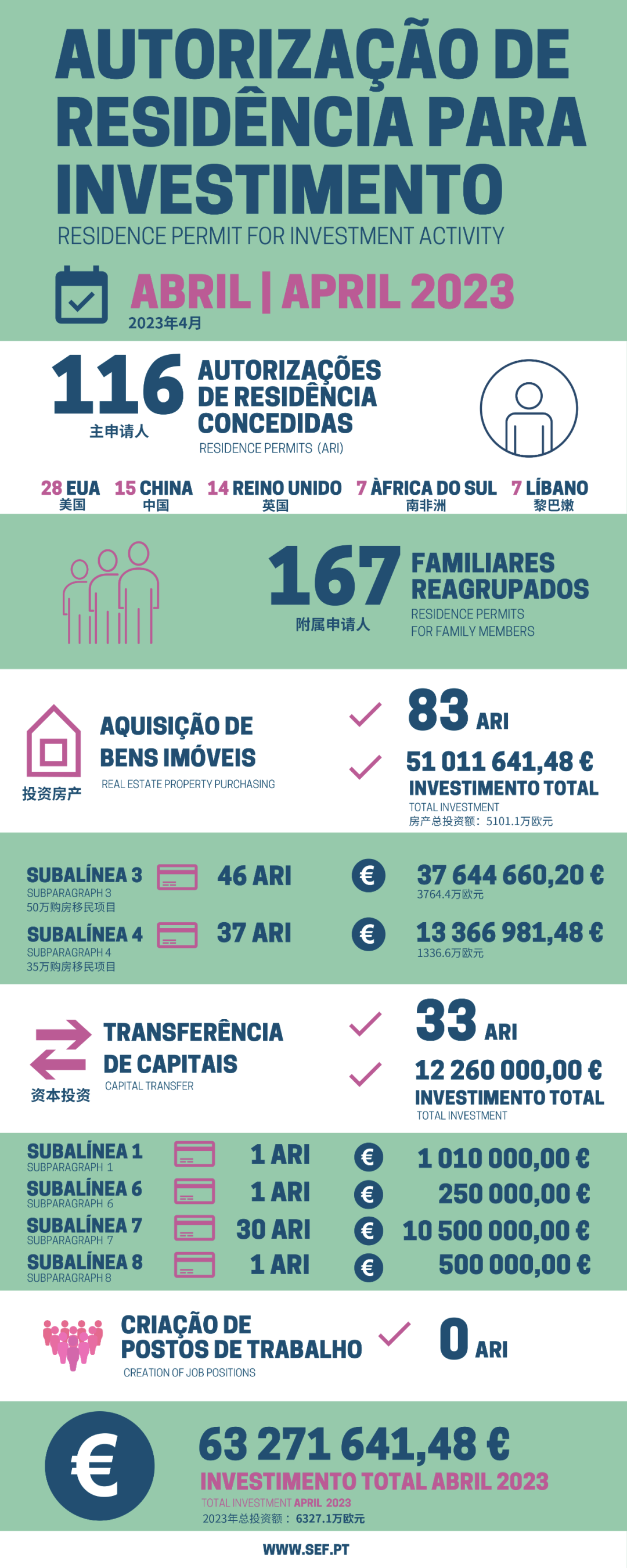 近日,葡萄牙移民局(SEF)正式發(fā)布了4月的黃金簽證最新統(tǒng)計(jì)數(shù)據(jù)。4月共有116位主申請人和167位附屬申請人獲批葡萄牙黃金簽證。獲批總?cè)藬?shù)為283人,總投資額約6327萬歐元。