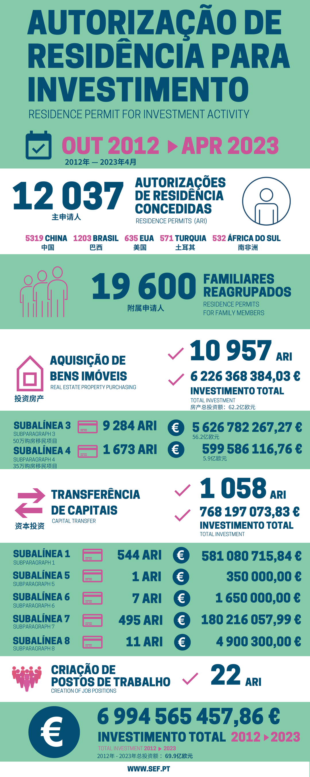 截至2023年4月,葡萄牙黃金簽證累計(jì)獲批主申請人12,037位,獲批附屬申請人19,600位。其中獲批的中國家庭已經(jīng)突破5,319,始終占據(jù)半壁江山;其次是巴西和美國。