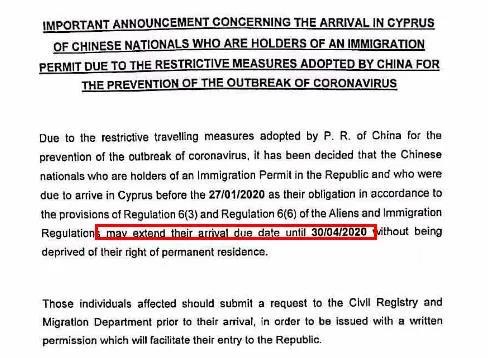 疫情發生后,很多塞浦路斯的永久居民不能如期進行兩年一次的登陸,經中國駐塞浦路斯使館的多次協調,塞浦路斯移民局出臺如下延期登陸解釋: