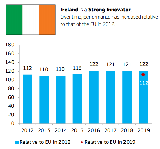 在新公布的《2020歐洲創新記分牌》中,愛爾蘭獲得高達122的分數,遠高于歐盟平均水平112分,再度榮獲“歐洲強大創新者”稱號。報告指出,愛爾蘭當前更為核心、重要的創新優勢集中體現在就業影響力、人力資源和充滿吸引力的科研體系。
