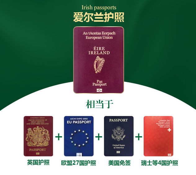 獲得愛爾蘭護照,不僅可以全球各地來去自如,還能自由定居英國、瑞士、歐盟27國(德、法、意、荷等),輕松移居美國!