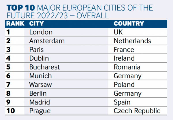 2月17日,《金融時報》旗下的《FDi Intelligence》發(fā)布最新《2022-2023年度歐洲未來城市和地區(qū)》報告,通過評估歐洲356個城市和148個地區(qū),倫敦、阿姆斯特丹、巴黎、都柏林和布加勒斯特名列前茅,被評為歐洲五大最具投資價值城市。