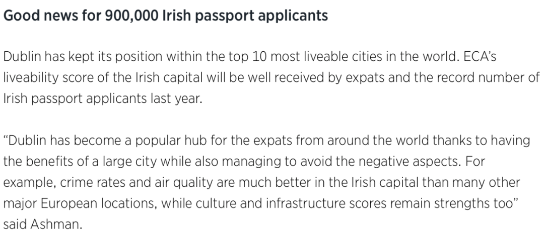 ECA國際分析師Neil Ashman表示:“對于來自世界各地的移民而言,都柏林已經成為一個備受歡迎的中心城市,其極低的犯罪率和極高的空氣質量遠遠優于其他歐洲主要城市,同時濃厚的文藝氛圍和優良的基礎設施配套也為它增分不少”