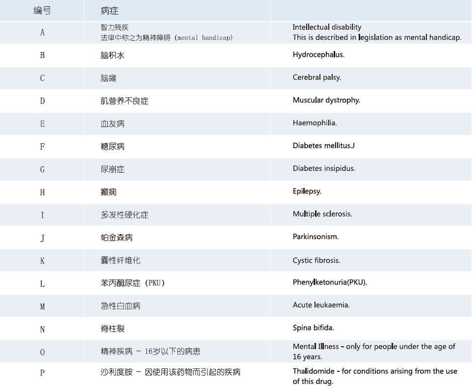 為患有某些長期疾病或身心殘疾的愛爾蘭居民提供免費的疾病治療,包括藥品、藥物、醫療和外科手術。該計劃的申請不以申請人的收入情況為評定條件,而是病史。符合“長期疾病醫療計劃”的疾病類型如圖所示: