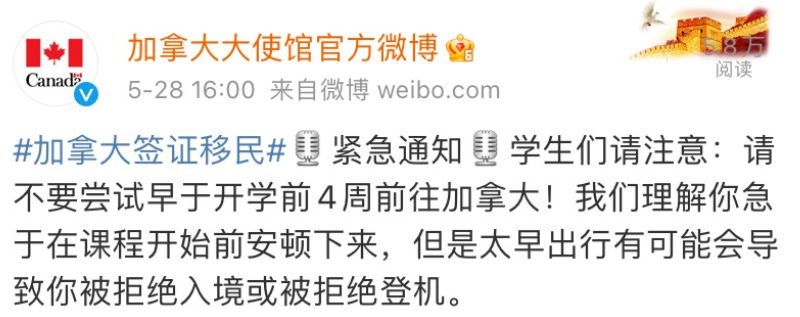 加拿大駐華使館緊急發(fā)布最新提醒:留學生請勿早于開學前四周抵達加拿大,極有可能被海關拒絕入境或被拒絕登機!如果9月7日開學,那么往前回溯四周28天,則不要預定早于8月10日抵達加拿大的航班。