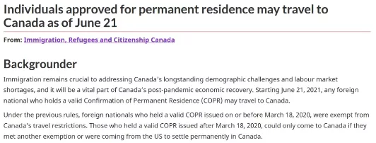 從2021年6月21日起,有效的COPR(移民永居確認信)持有者可以登陸加拿大啦!