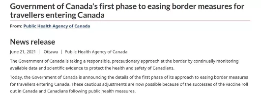 6月21日,加拿大聯邦政府宣布放寬兩項入境限制: