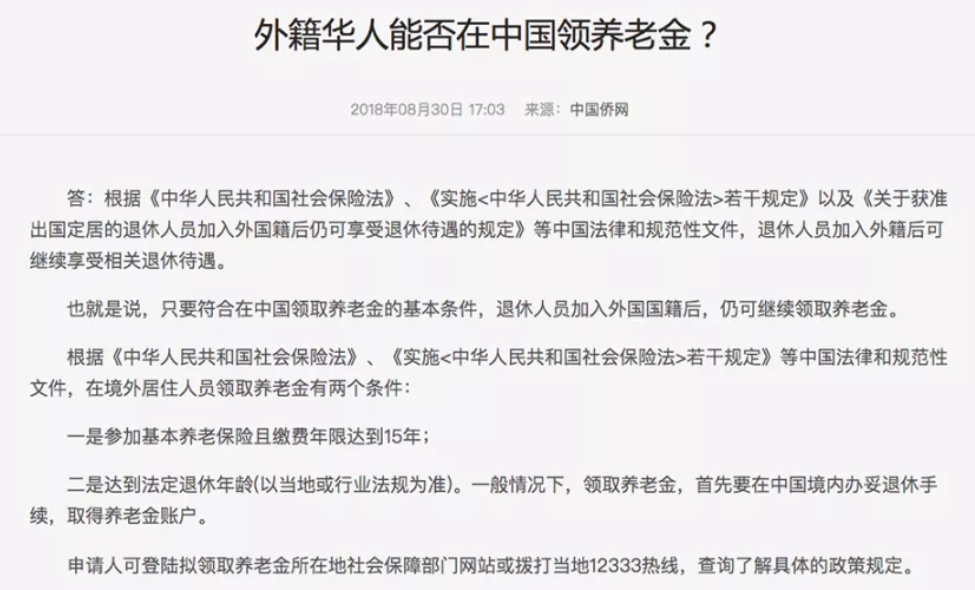 近些年,選擇移民海外的中國人越來越多。但部分海外華人并不知道還有此類政策。其實,根據中國官方相關規定退休人員加入外籍確實可享受相關退休待遇,這一政策已實施將近40年。在境外居住人員領取養老金有兩個條件:一是參加基本養老保險且繳費年限達到15年;二是達到法定退休年齡(以當地或行業法規為準)。