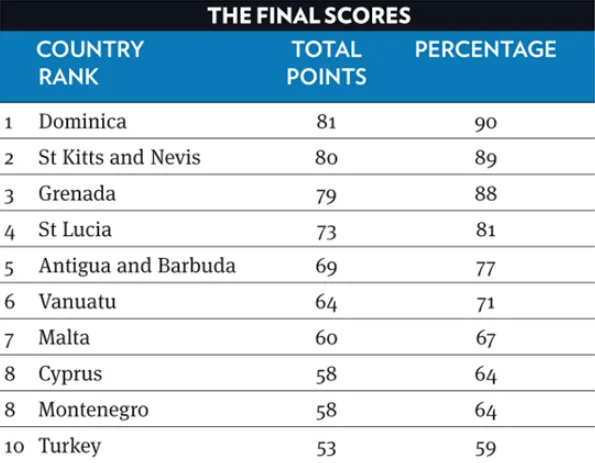 綜合比較中,加勒比海國護照繼續保持歷年以來的領先地位,多米尼克護照拔得頭籌,圣基茨護照和格林納達護照分列第二和第三。