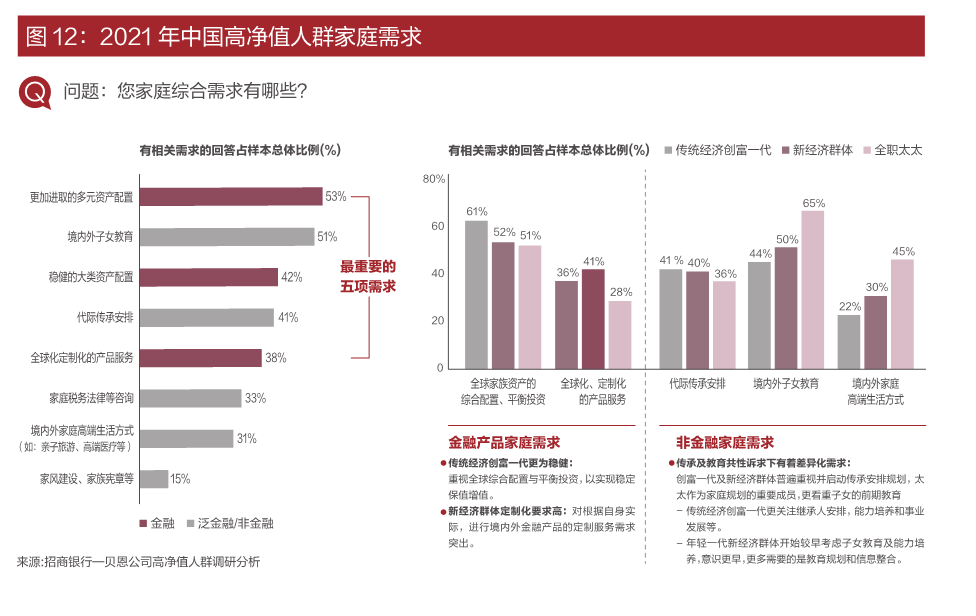 2021年,高凈值人群年輕化趨勢(shì)凸顯,40歲以下高凈值人群成為中堅(jiān)力量,占比42%。縱觀2021年高凈值人群家庭需求,多元化的資產(chǎn)配置、境內(nèi)外子女教育、穩(wěn)健的大類(lèi)資產(chǎn)配置、代際傳承安排、全球化定制化的產(chǎn)品服務(wù)占據(jù)了前5名。