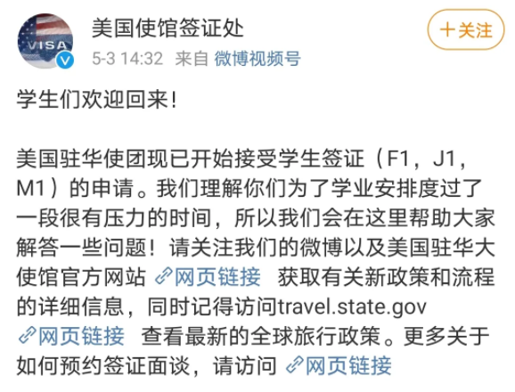 美恢復了對中國留學生的簽證工作
