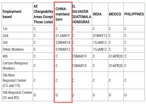 ·EB-5直投類別無排期;EB-5區(qū)域中心類別顯示“U”,受法案到期影響暫不可用。