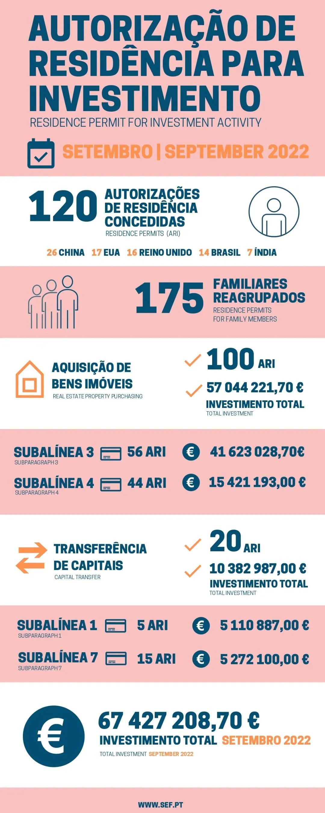10月8日,葡萄牙移民局發(fā)布了9月的黃金簽證審批數(shù)據(jù),共有120位主申請(qǐng)人和175位附屬申請(qǐng)人獲批,總投資額約6743萬(wàn)歐元。2022年前9個(gè)月,葡萄牙移民局已經(jīng)給926戶家庭簽發(fā)了黃金簽證,超過(guò)了2021年全年的簽發(fā)量。