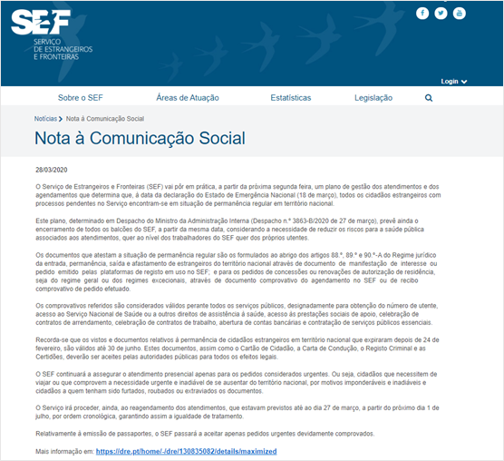 葡萄牙移民局將目前處于等待狀態(tài)的移民身份合法化,所有在葡萄牙移民局已經(jīng)提出申請的外國公民身份都將在葡萄牙本國得到承認,只需持有在3月18日宣布國家緊急狀態(tài)之日前向移民局提出的申請憑證。此類文件可充當臨時居留,持有此類文件在葡居留將視為合法居留,可享受本國所有醫(yī)療保障及社會保障等。