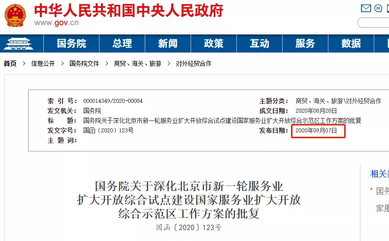 9月7日,國務院發布了關于深化北京市新一輪服務業擴大開放綜合試點建設國家服務業擴大開放綜合示范區工作方案的批復。