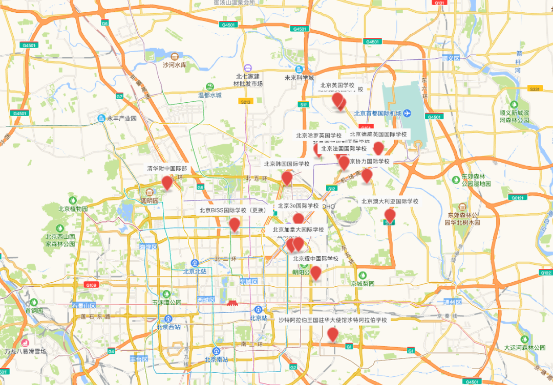 目前,北京外籍人員子女學校在北京的分布如下圖所示,主要集中在北京的東部和東北部區域。
