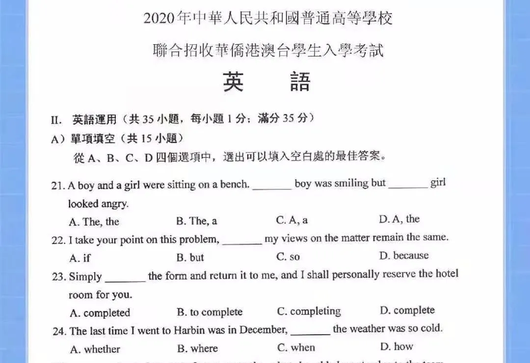 大家來感受下2020年華僑生聯考試卷: