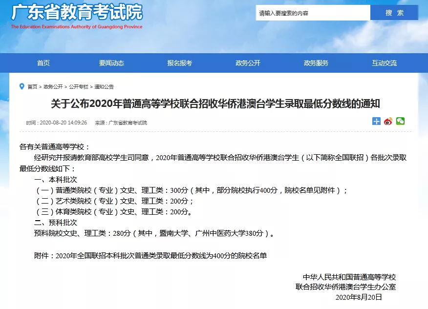 根據廣東教育考試院發布的2020年華僑生聯考錄取最低分數線的信息,僅200分即可入讀藝術類、體育類院校,400分即可入讀985、211高校,如清華大學、北京大學、復旦大學、中國人民大學等等。