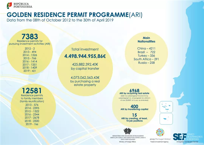 葡萄牙移民局(SEF)發布截至2019年4月30日“黃金簽證”大數據: