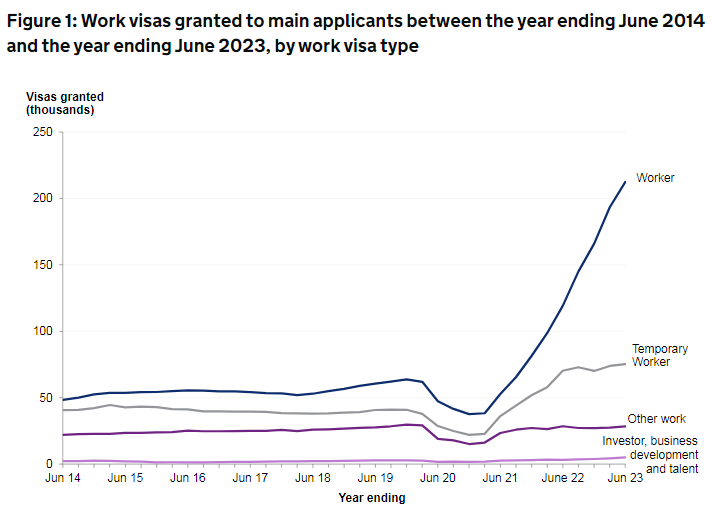 英國內(nèi)政部的官方數(shù)據(jù)顯示:在截至今年6月的一年里,英國發(fā)放了近54萬份工作簽證(包括家屬在內(nèi))。相比2022年同期大增63%,工作簽證一躍成為全球移英家庭的“新寵”。